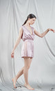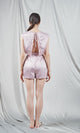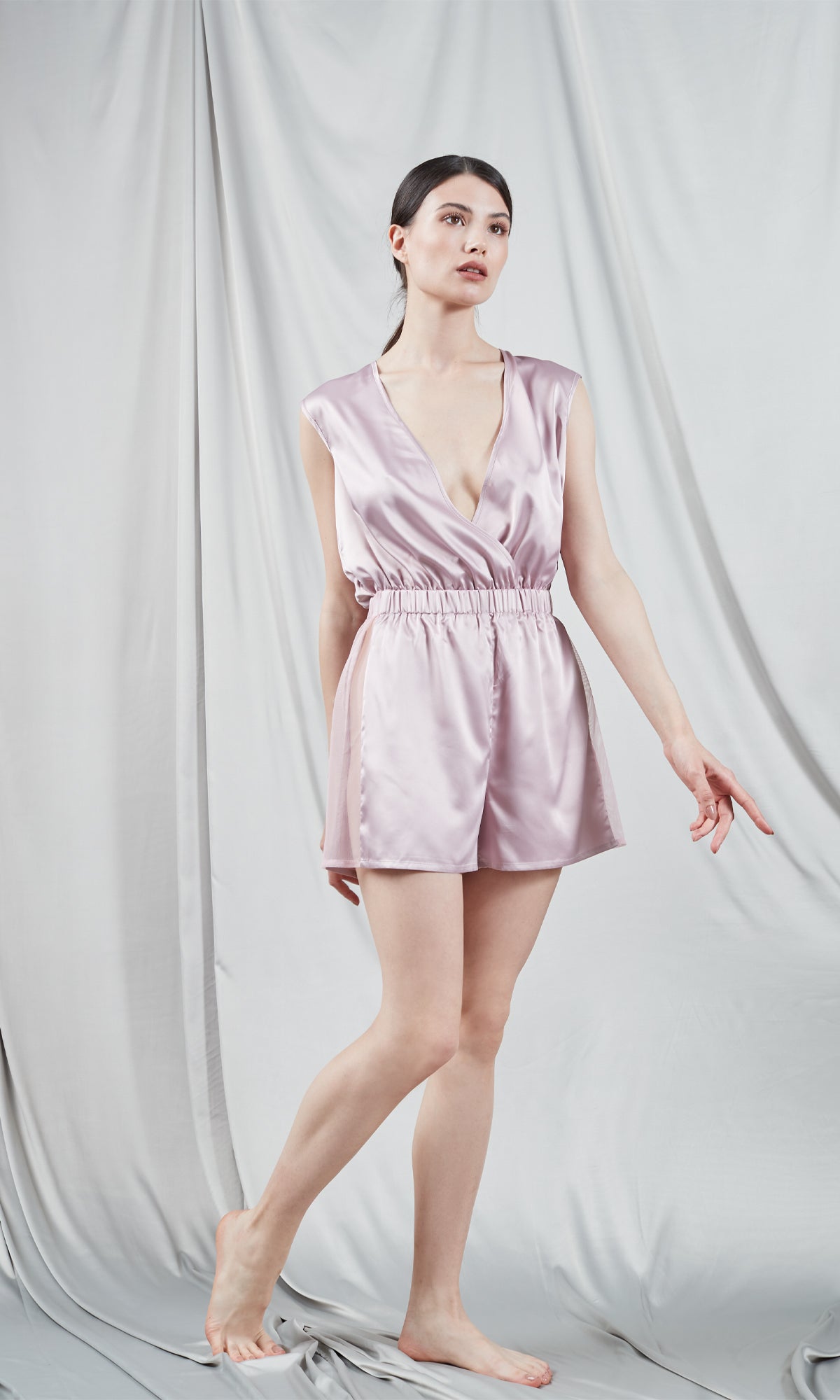 Pale pink jumpsuit crafted from fine silk with a smooth texture and luxurious look. The design features a deep V-neckline that adds a touch of sensuality, while the elastic waist ensures a flattering and comfortable fit. The jumpsuit is cut in a relaxed fit with short pants that allow freedom of movement. This versatile piece combines simple elegance with a feminine style and can be worn both as homewear and for a casual outing. The shiny material emphasizes the quality and premium finish of the product.