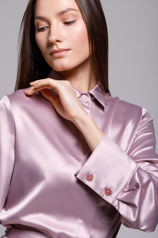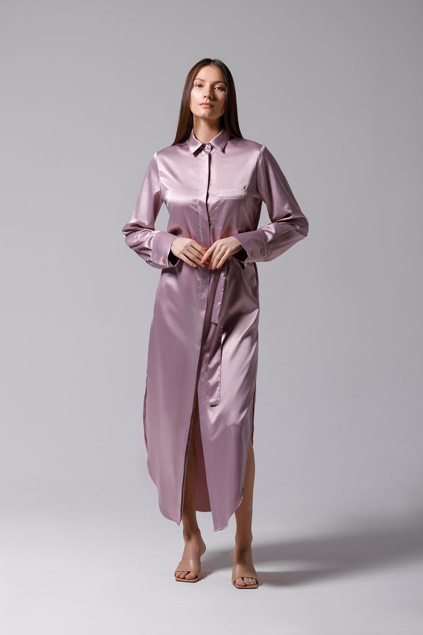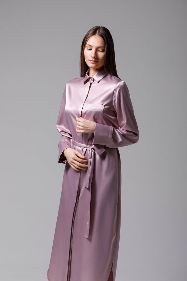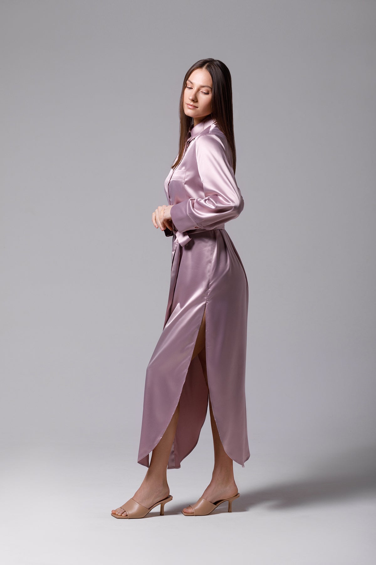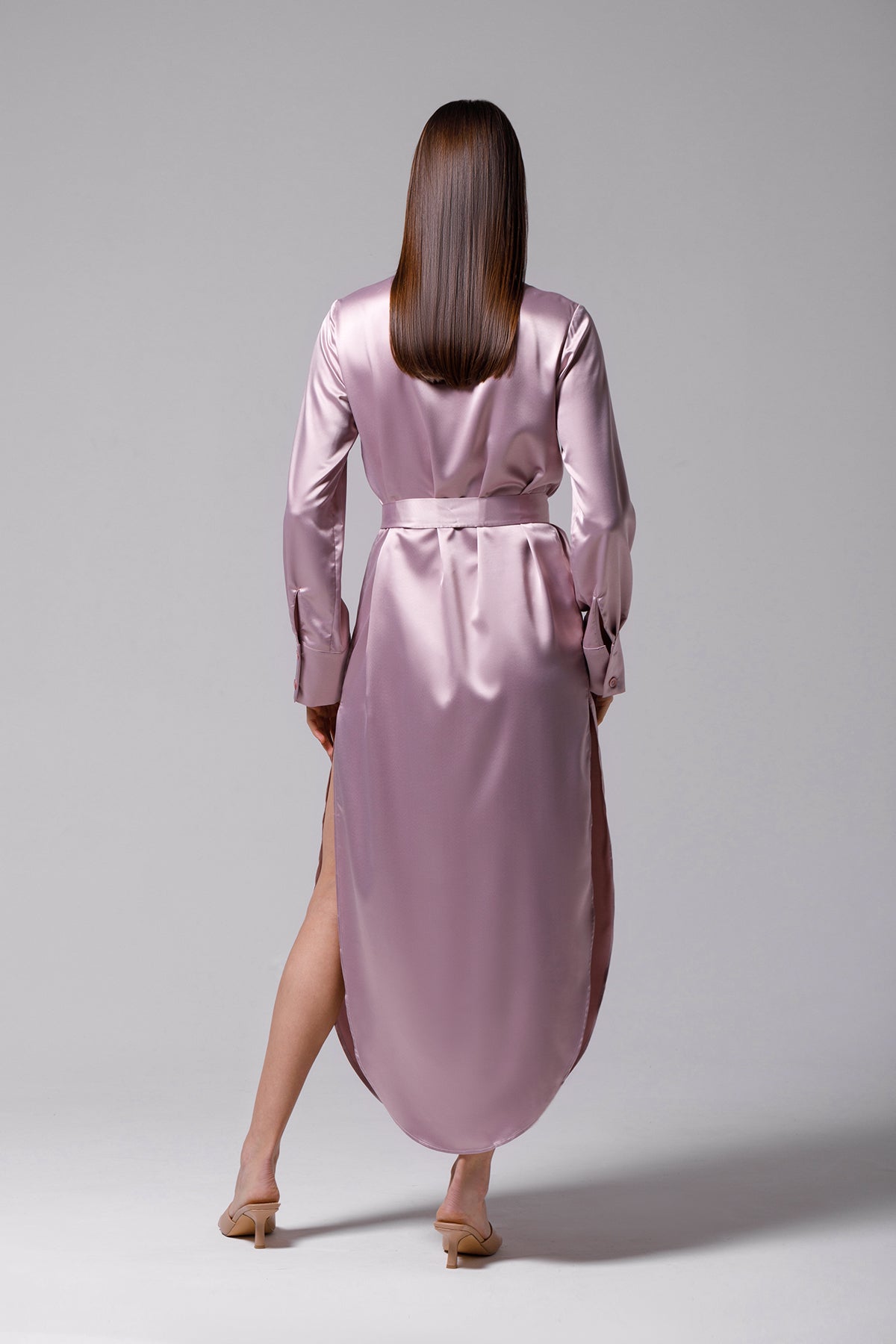 The pink maxi shirt dress is simply irresistible. Made from an extremely soft satin material, this piece is perfect for relaxing while sleeping, but also for enjoying luxury during the day. It has a long cut and a loose silhouette, providing the necessary comfort at any time of the day. In addition, it is detailed with button closures at the front and has a curved hem, and for an extra touch of style, it is accessorized with a matching belt, which beautifully highlights your waist.