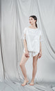 The T-shirt with a casual-elegant model and ivory color. The modern design includes a wide round collar and short sleeves, detailed with floral lace inserts that add a touch of finesse. The T-shirt has a wide and relaxed cut, with a rounded hem, which offers a fluid and comfortable fall. It is made of silk giving a touch of luxury and comfort. This versatile piece is perfect in your everyday wardrobe or as part of a lounge or pajamas ensemble.