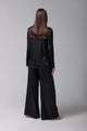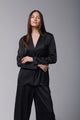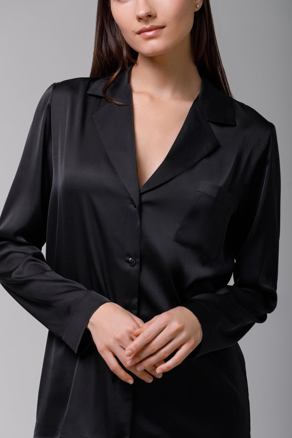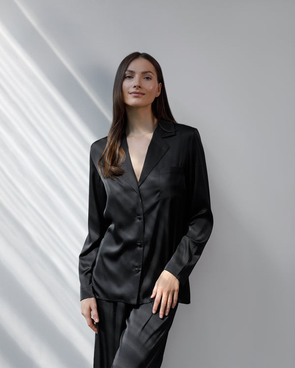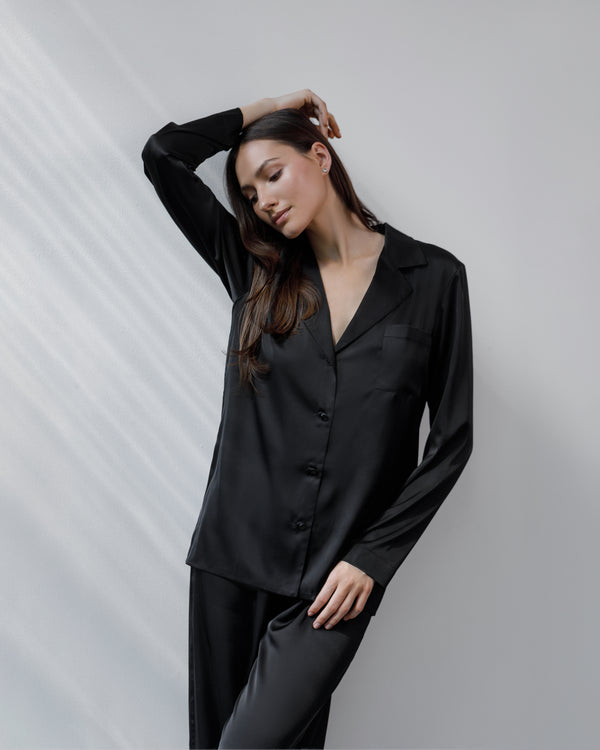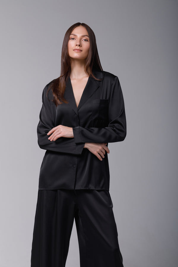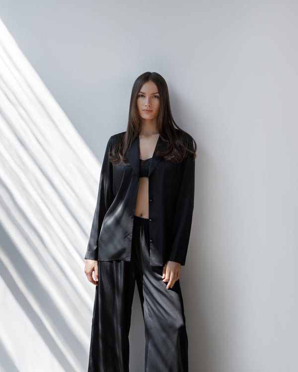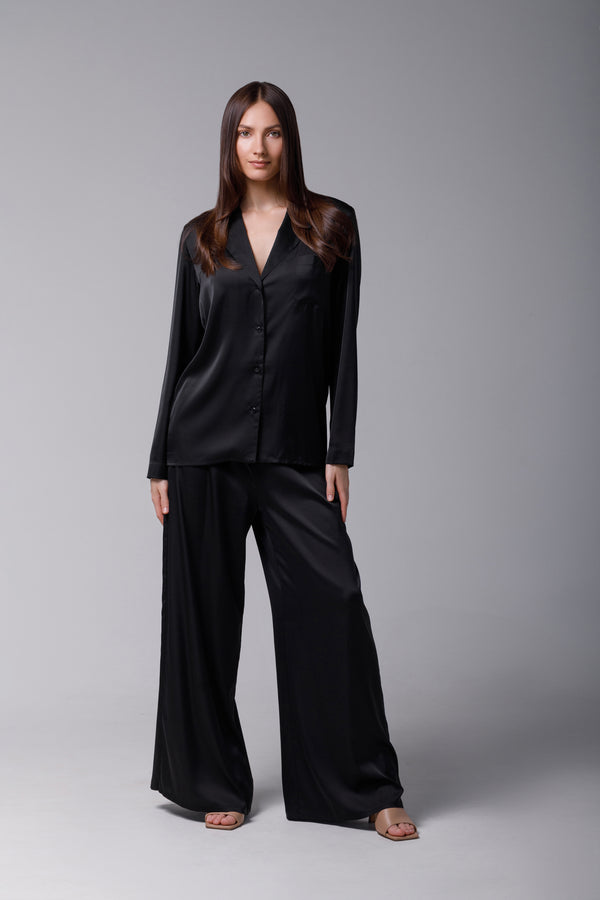 Set de pijama ce prezintă un design clasic, cu o notă de eleganță indiscutabilă. Este alcătuit dintr-un top cu mâneci lungi și pantaloni lungi, ambele într-o nuanță profundă de negru . Pijamaua este realizată din satin, ceea ce îi conferă o textură fluidă și un luciu subtil.