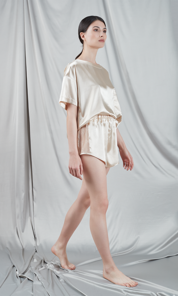 Pantaloni realizați din satin fină de culoare champagne, oferă un aspect luxos și confortabil. Designul include o talie elastică pentru o potrivire sigură și confortabilă, iar detaliile din dantelă aplicate pe laterale adaugă o notă de feminitate și rafinament. Lungimea scurtă și croiala lejeră contribuie la o siluetă aerată și relaxată, făcând acești pantaloni perfecți pentru a fi purtați acasă sau ca o piesă sofisticată de loungewear. Finisajul satinat subliniază calitatea superioară și estetica îngrijită a brandului.