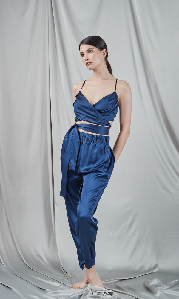 Top sofisticat din satin de culoare albastru marin care emană un aer de eleganță discretă. Designul are bretele subțiri reglabile și o decupare îndrăzneață în față, oferind o notă senzuală. Croiala înfășurată a topului creează un aspect interesant la nivelul taliei, accentuat de o secțiune elastică subtilă care adaugă un plus de formă și textură. Acest top este un exemplu de îmbinare între rafinament modern și confort, fiind perfect pentru a adăuga un strop de lux ținutelor de zi sau de seară.