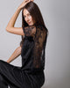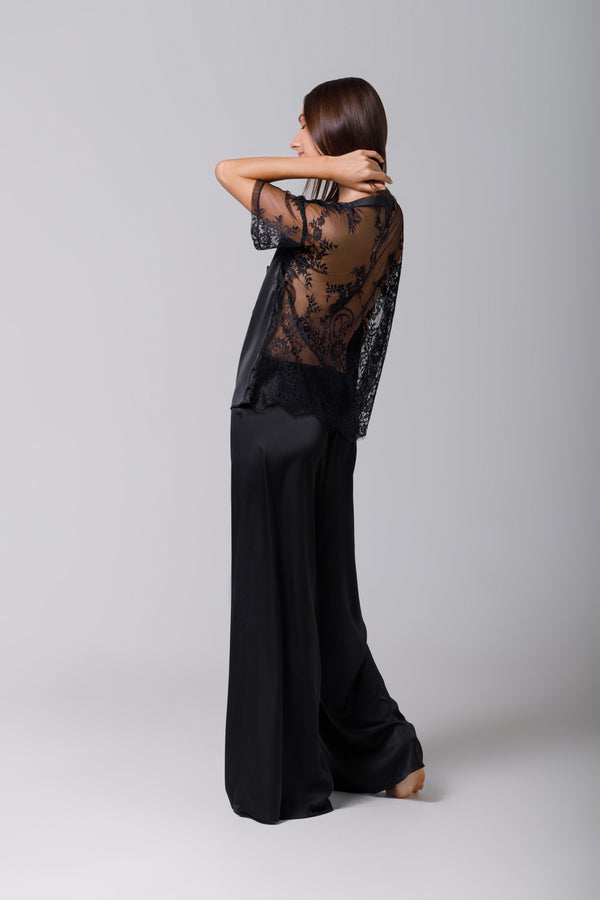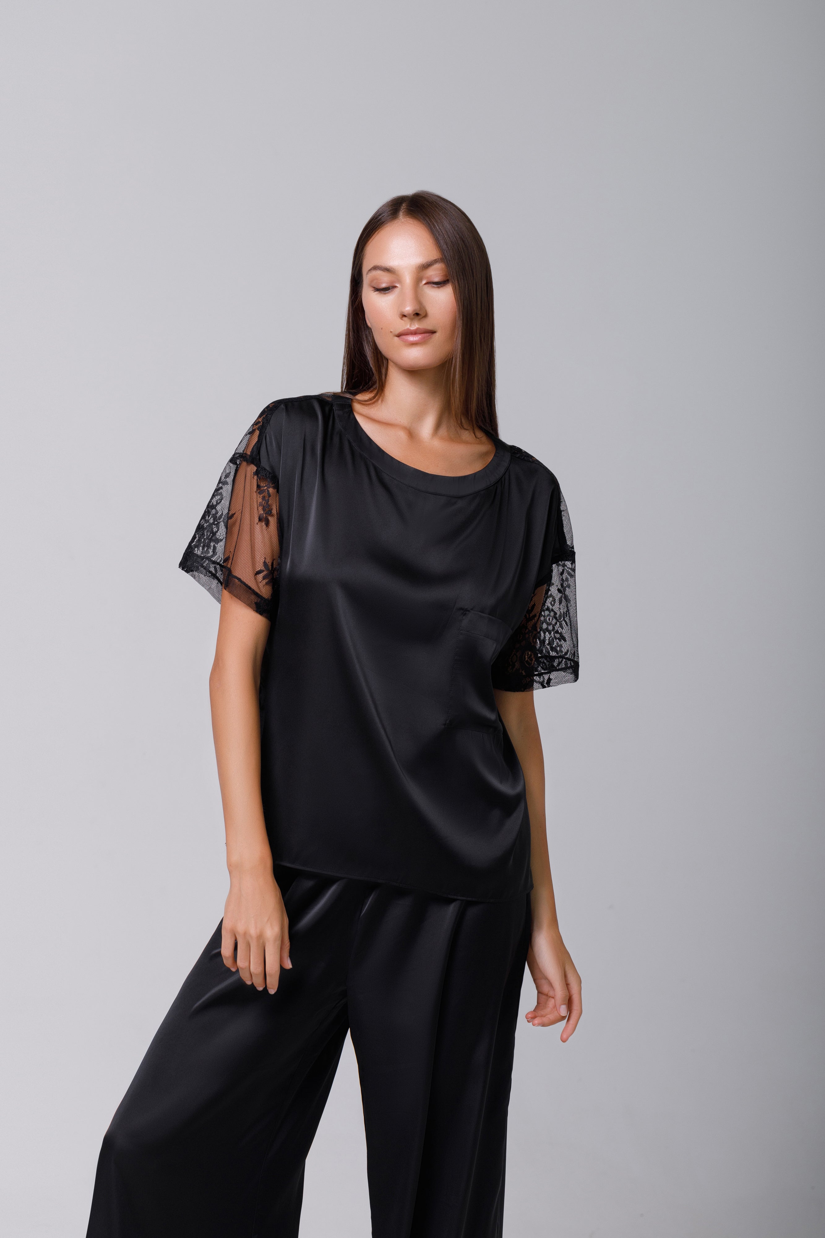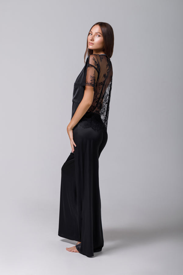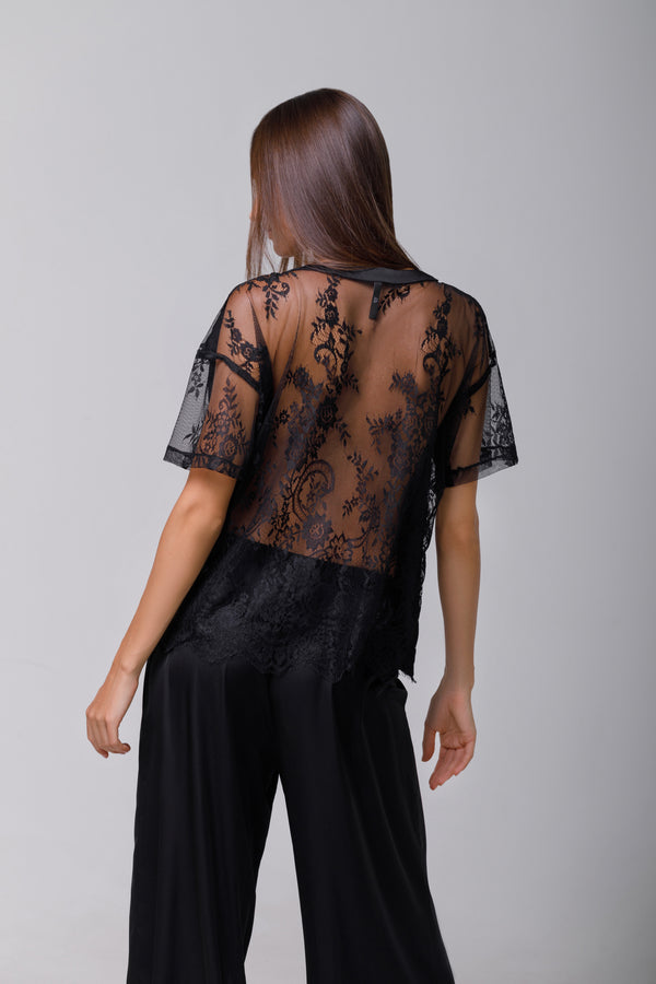 Tricou din satin negru cu dantelă